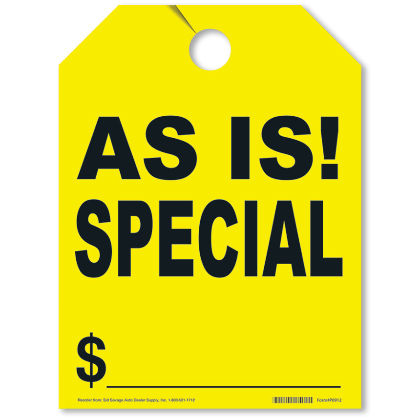 "As Is Special" Fluorescent Yellow Rear View Mirror Tags are made of a fluorescent yellow stock paper with black print. Mirror tags easily attach to any rear view mirror and can be removed quickly for test drives. Mirror Tags are 9"W x 12"H and are sold 50 per pack.