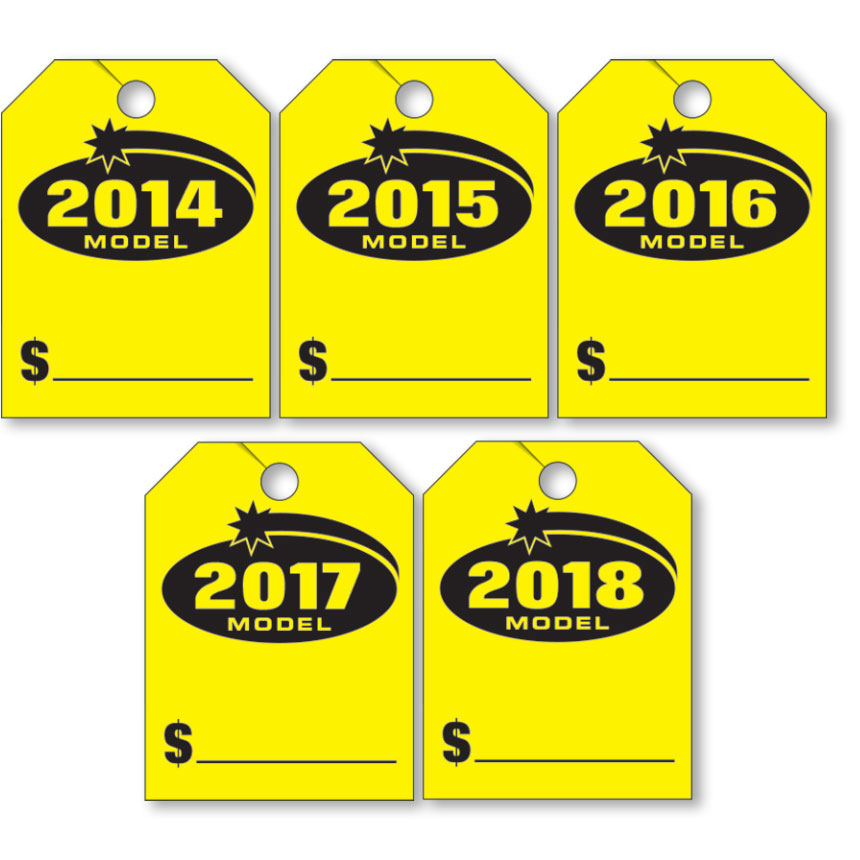 If you have vehicles for which you're particularly proud of their condition, these mirror tags are great for highlighting their model year and price. Choose model year (2014 thru 2018) or combo pack. Tags measure 9"x12" and are sold 50 per pack.