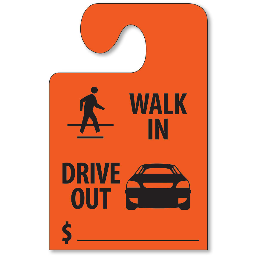 Need a way to advertise a special sale? Our Fluorescent Red "Walk In, Drive Out" Hook Rear View Mirror Tags will deliver your message and work well with vehicles that have large rear view mirrors. The print is in bright red and the tags are made of a fluorescent yellow stock paper and can be removed quickly for test drives. Hook Tags are sold in packs of 50 and measure 9" X 14".