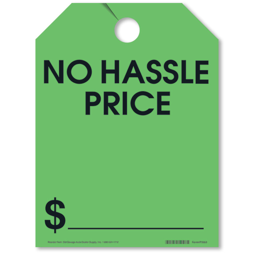 Get your information across whether your dealership is open or not with our Green "No Hassle Price" Fluorescent Rear View Mirror Tags. Rear view mirror tags are made of a fluorescent green stock paper. Mirror tags easily attach to any rear view mirror and can be removed quickly for test drives. Hanging mirror tags are sold 50 per pack. Each Green "No Hassle Price" Fluorescent Rear View Mirror Tag is 9"W x 12"H.