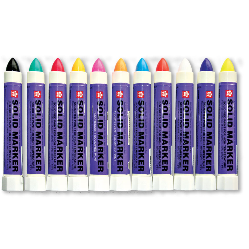 For tough jobs at your dealership, choose our Solid Paint Markers. They mark through oil, grease, rust, mud, and snow, inside or outside. Solid Markers won't fade or wash off. Dries in 5-7 minutes and the special twist top keeps paint fresh and ready to use. Comes off easily with a scraper/razor blade or mineral spirits. Temperature range of 14-212 degrees Fahrenheit. Kit includes 11 markers, one of each color (Black, Blue, Green, Fluorescent Orange, Orange, Purple, Red, Fluorescent Pink, White, Yellow, and Fluorescent Yellow). Markers can also be purchased individually as 1300398.